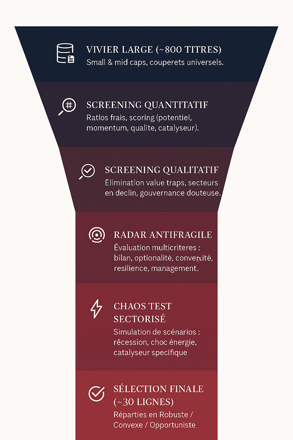 Notre processus n’anticipe pas l’avenir, il élimine. Ratios quantitatifs, analyse qualitative, Radar antifragile, Chaos Test sectorisé : chaque filtre réduit le bruit, jusqu’à ne conserver qu’une trentaine de lignes robustes, convexes ou opportunistes.